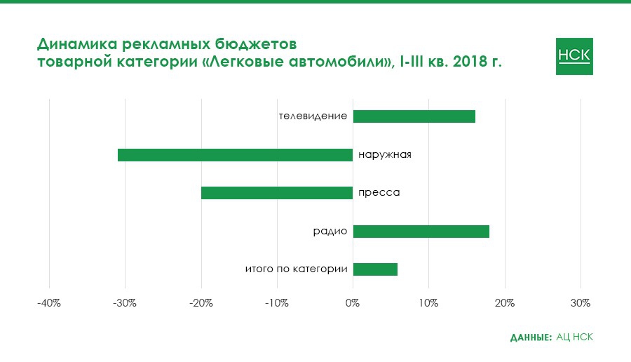 Крупнейшая в сегменте радио товарная категория «Легковые автомобили» в отчетном периоде стала одной из самых быстрорастущих, хотя и замедлила рост в III квартале. В сумме по всем четырем медиа динамика рекламных бюджетов в этой категории за три квартала составляет 6%.