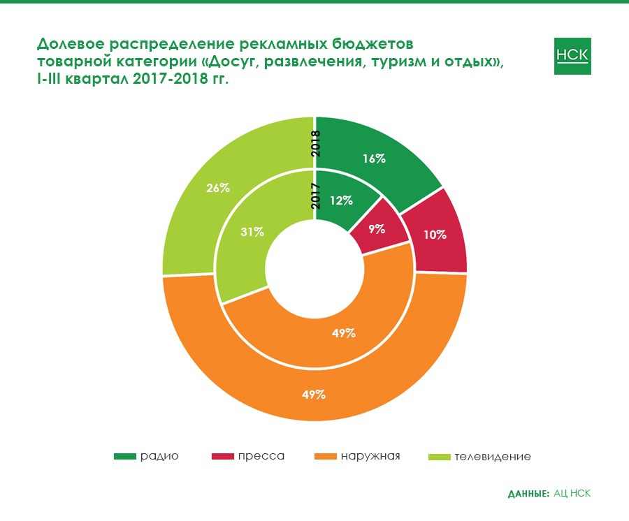 В категории «Досуг, развлечения, туризм и отдых» по итогам 9 месяцев 2018 года произошли заметные изменения превалирующих ранее тенденций. Так, данная категория стала самой быстрорастущей из представленных в сегменте радио, в то время как рекламные расходы на ТВ и в «наружке» значительно сократились.