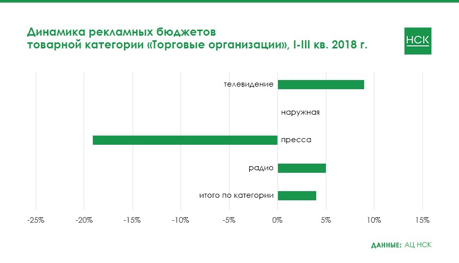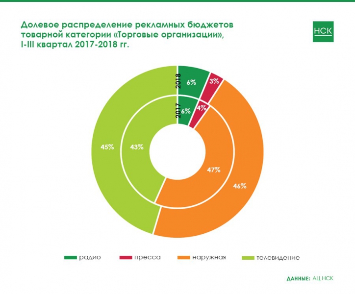«Торговые организации» — категория, которая по итогам рассматриваемого периода является третьей по величине на рекламном рынке в целом и второй в сегменте радио.