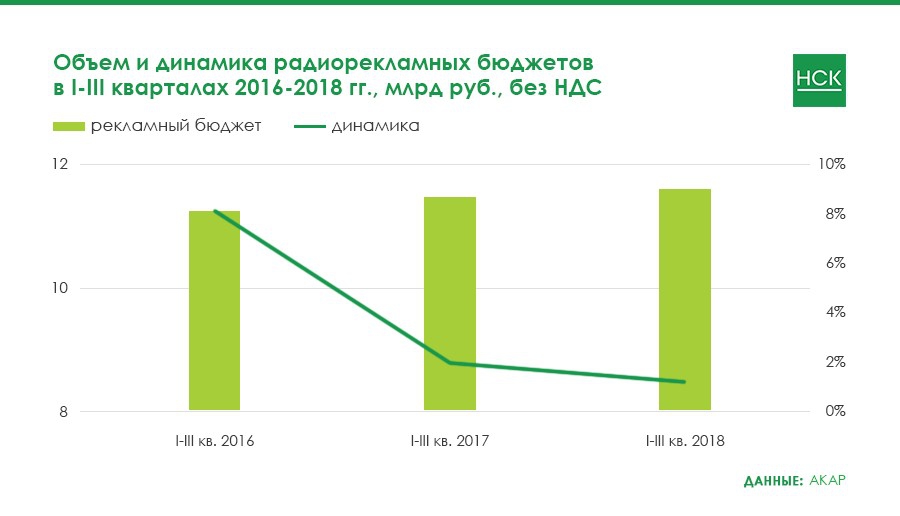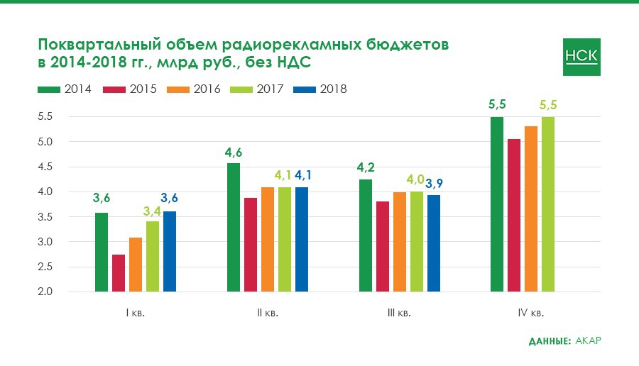 Второй и третий кварталы 2018 года оказались для радиорекламного рынка не очень удачными, динамика была приближена к нулевой. Показатели I квартала являются наилучшими в отчетном периоде (+5%).