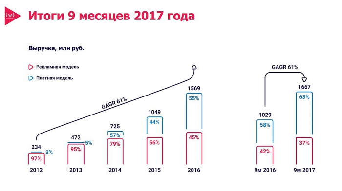 Аудитория ivi около 31 млн. человек. Выручка компании по итогам девяти месяцев 2017 года выросла на 62% до 1,667 млрд рублей, при этом платная модель растет быстрее рекламной. Видеорекламу на ivi с 1 января 2018 года начнет продавать Gazprom-Media Digital вместо селлера IMHO. Доходы российских онлайн-кинотеатров в первом полугодии 2017 года составили 5,3 млрд. рублей, по итогам года они достигнут 10 млрд. рублей, сделал прогноз гендиректор ivi Олег Туманов.