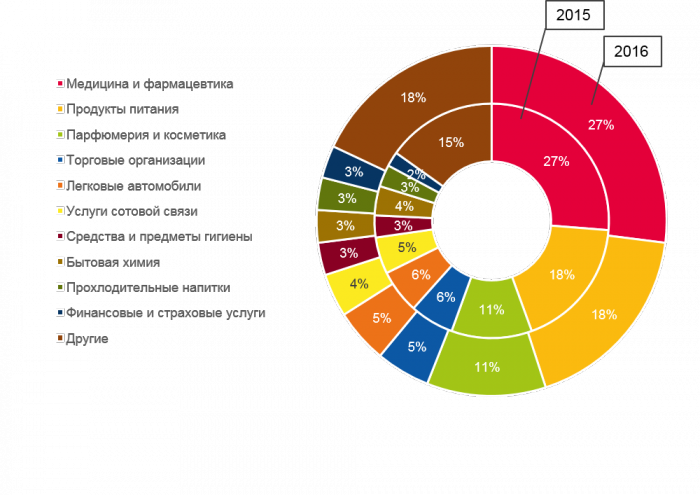 В рейтинге крупнейших категорий товаров и услуг (по размеру суммарного рекламного бюджета) за рассматриваемый период не произошло значительных изменений относительно прошлого года. Практически каждая категория из первой десятки сохранила свой вес на рынке. Лидерство по объему расходов на рекламу по-прежнему сохраняют производители лекарственных препаратов – категория занимает более четверти рынка. Второе и третье место у «Продуктов питания» и «Парфюмерии и косметики». Суммарно на три категории приходится более половины рынка.
