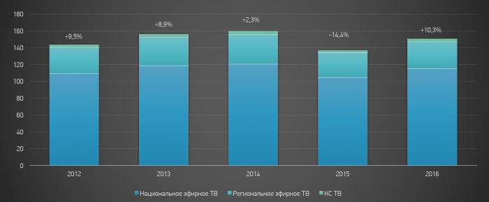 По итогам 2016 г. общий объем средств, затраченных рекламодателями на телевизионную рекламу, вырос на 10.3% по сравнению с предыдущим годом и составил 150.8 млрд. руб. (Рисунок 1). Положительная динамика имеет место, даже если произвести расчет в долларах (+1.2%). Налицо восстановление рынка после падения в 2015 г., но можно ли говорить о выходе из кризиса? Попробуем разобраться в этом вопросе.
