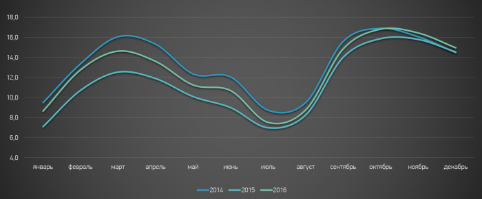Начнем с того, что вернуться к докризисным показателям суммарных бюджетов пока не удалось, тем не менее абсолютные значения максимально к ним приблизились (объем телерекламного сегмента в 2014 г. составил 159.8 млрд. руб.). Если посмотреть, как развивалась ситуация на протяжении всего 2016 г., можно зафиксировать постепенное снижение динамики телерекламного сегмента от месяца к месяцу – в начале года мы имели рост более 21% к прошлому году, а к декабрю - уже менее 4% (Рисунок 2).