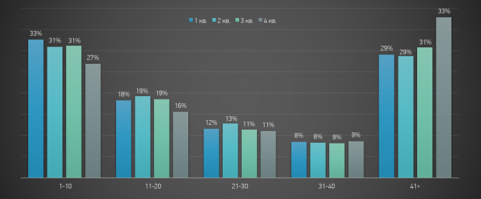 Уже несколько лет подряд именно четвертый квартал становится периодом максимальной рекламной активности относительно небольших рекламодателей (группа 41+). Если принять их общий годовой бюджет за 100%, то получится, что в четвертом квартале было потрачено 36% всех средств. То есть почти вдвое больше, чем в любой другой квартал.